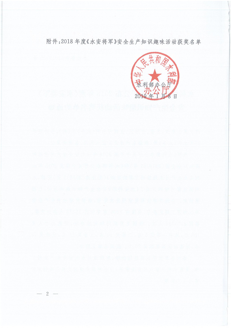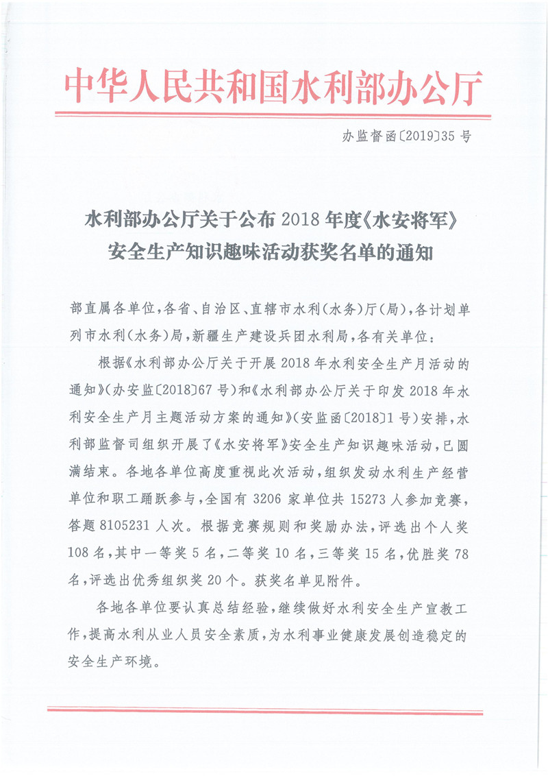水利部辦公廳關于公布2018年度《水安將軍》安全生產知識趣味活動獲獎名單的通知