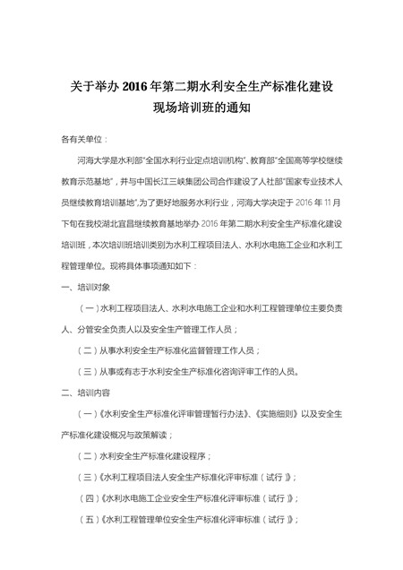 關(guān)于舉辦2016年第二期水利安全生產(chǎn)標(biāo)準(zhǔn)化建設(shè)現(xiàn)場(chǎng)培訓(xùn)班的通知