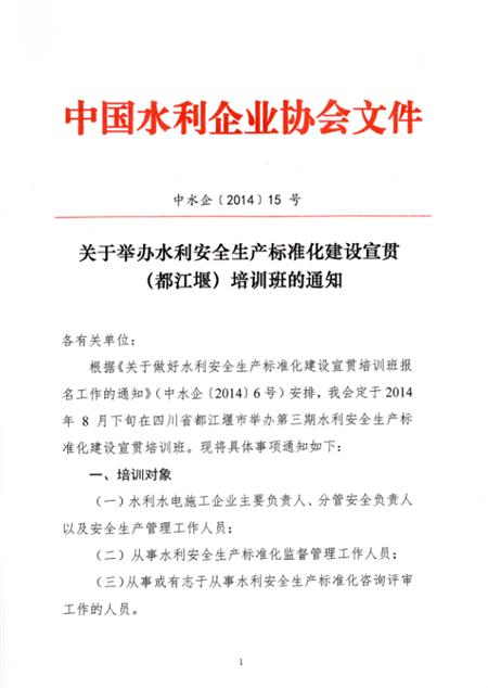 關(guān)于舉辦水利安全生產(chǎn)標(biāo)準(zhǔn)化建設(shè)宣貫(都江堰)培訓(xùn)班的通知