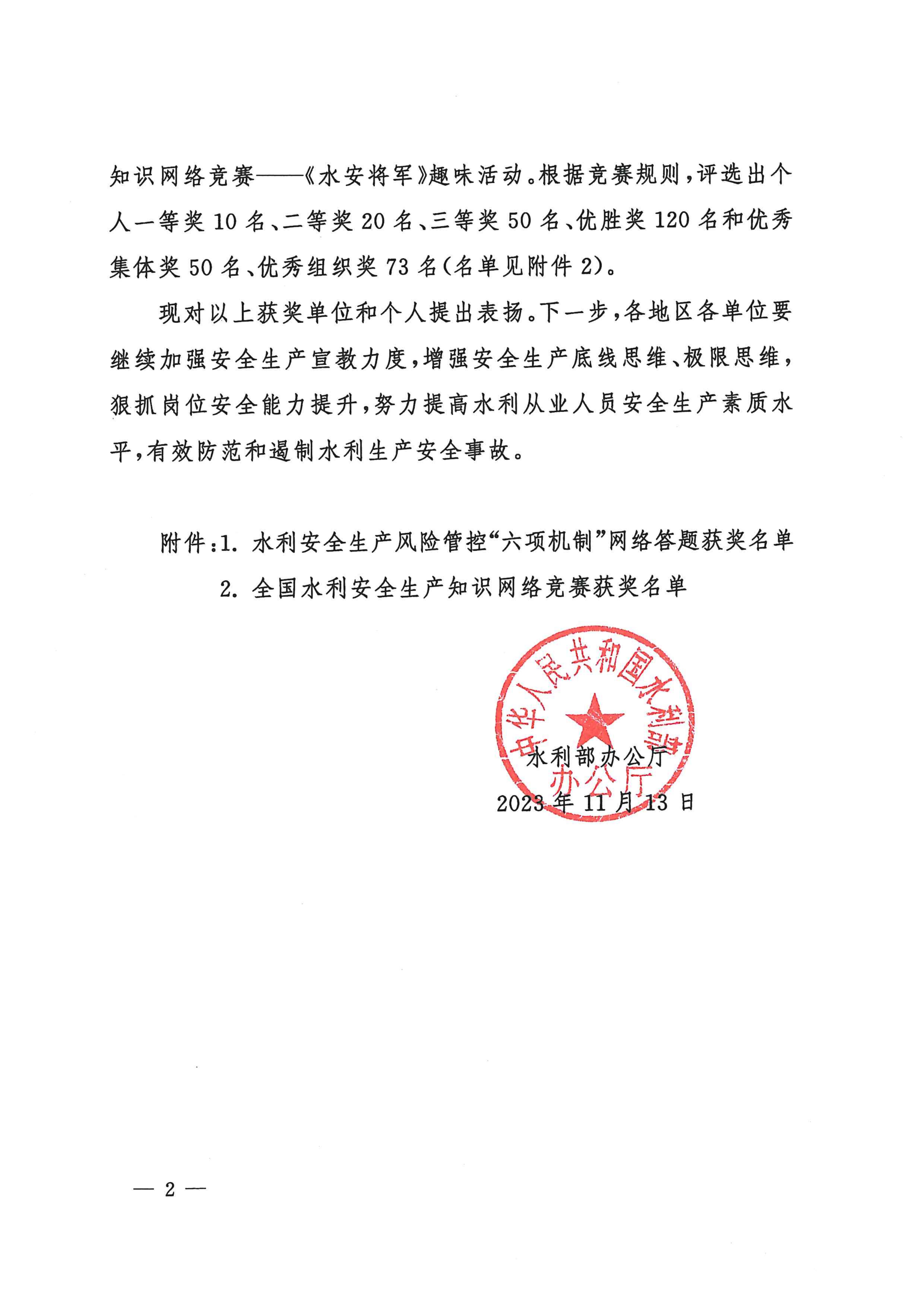 水利部辦公廳關于公布2023年水利安全生產風險管控“六項機制”網絡答題和全國水利安全生產知識網絡競賽獲獎名單的通知.pdf