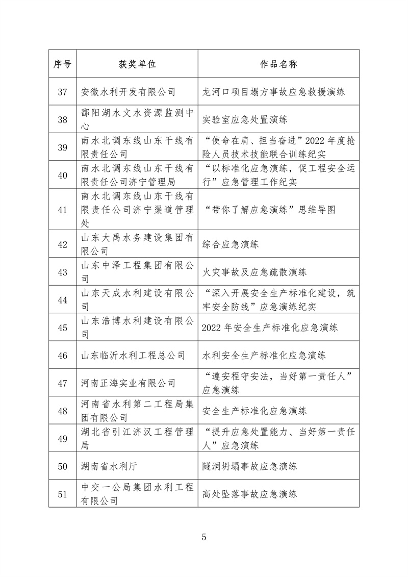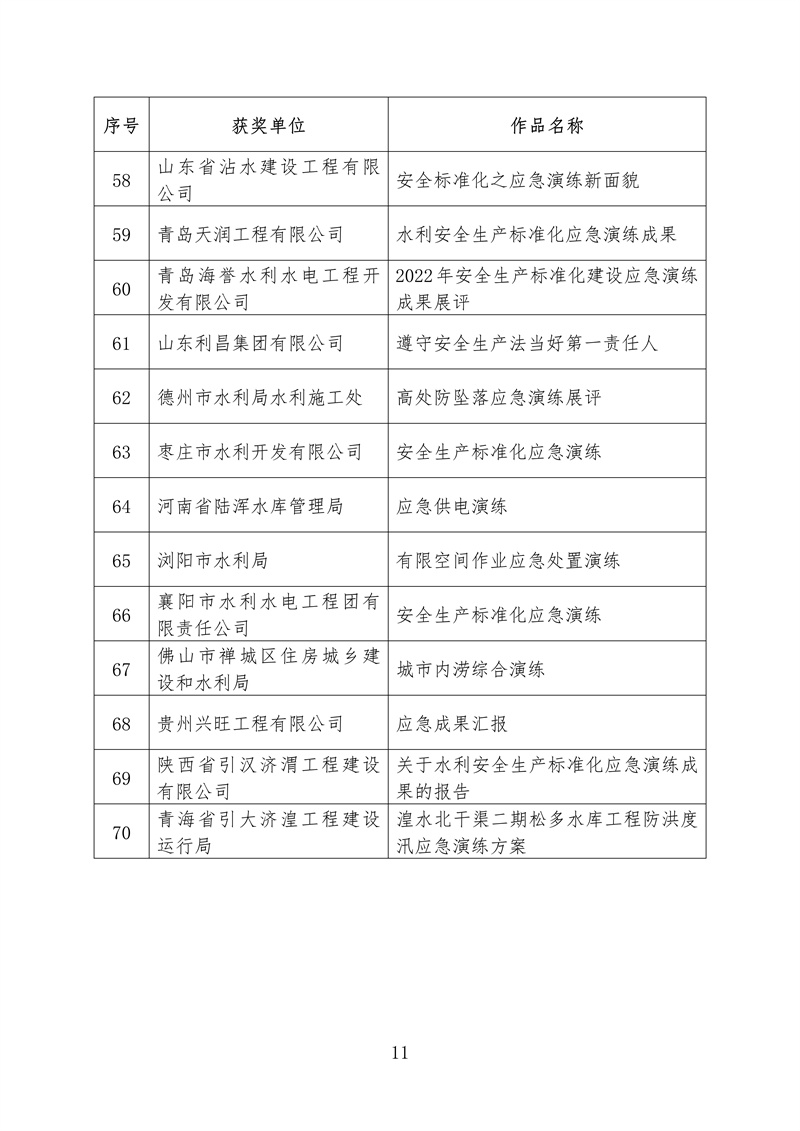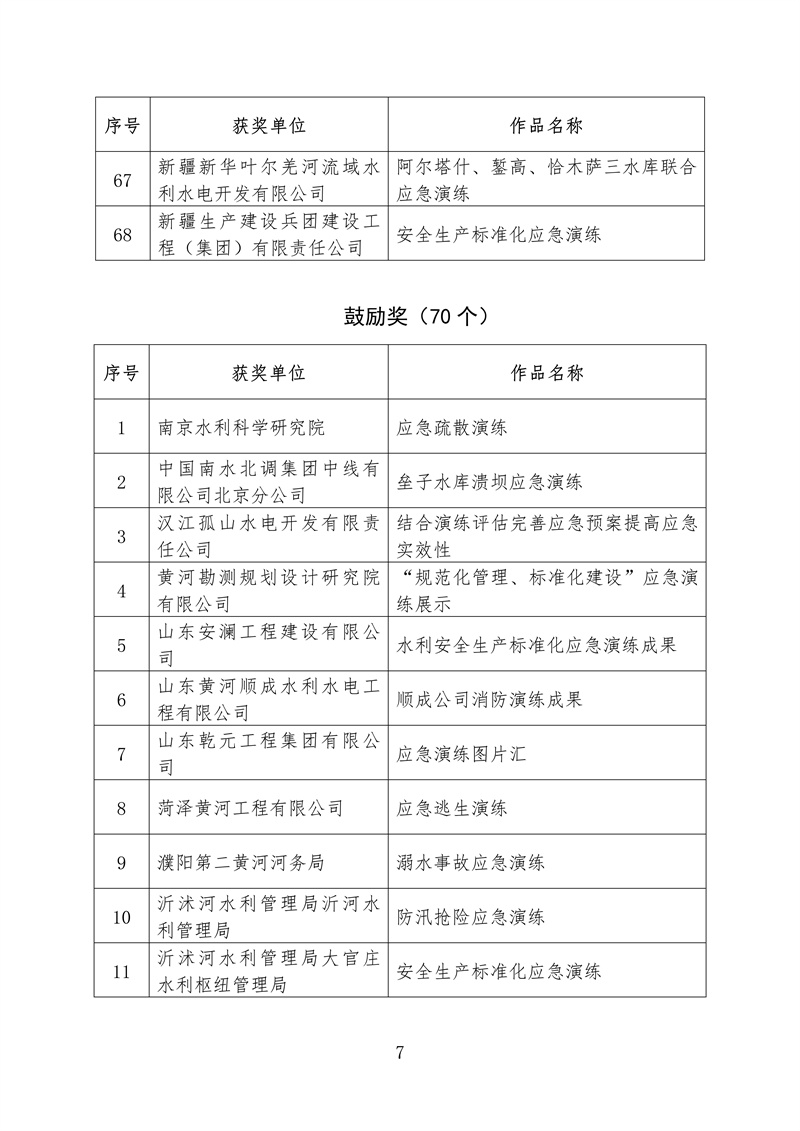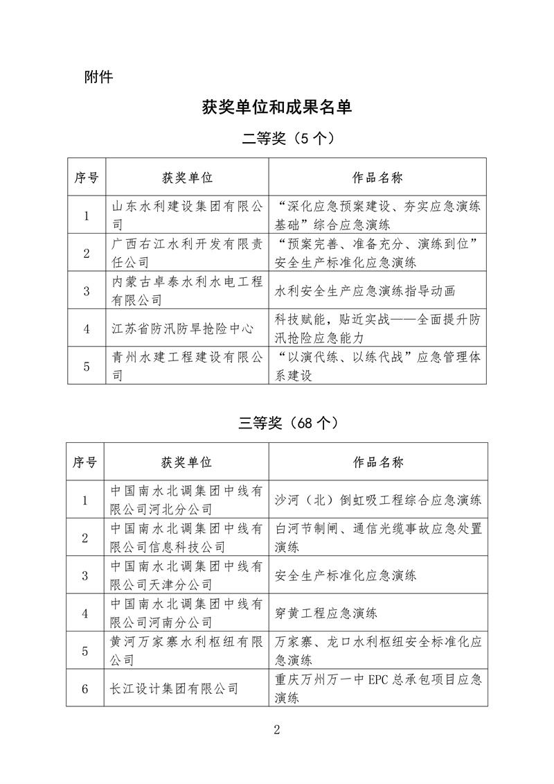? 根據《水利部辦公廳關于開展2022年水利“安全生產月”活動的通知》(辦監督〔2022〕159號),我部組織開展了全國水利安全生產標準化應急演練成果評選展示活動。根據競賽規則和獎勵辦法,擬對獲獎單位和成果進行公布,其中二等獎5個、三等獎68個、鼓勵獎70個、優秀組織單位獎10個,現予以公示(名單附后,一等獎空缺)。如有異議,請在公示期內以書面方式反映,并提供必要的證明材料和有效聯系方式。個人提出異議的,須在書面異議材料上簽署真實姓名,并附本人有效身份證明復印件;以單位名義提出異議的,書面異議材料須經本單位法定代表人簽字,并加蓋本單位公章。