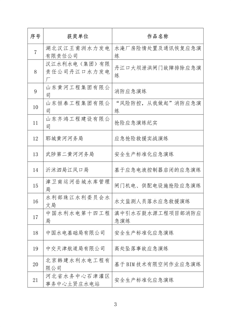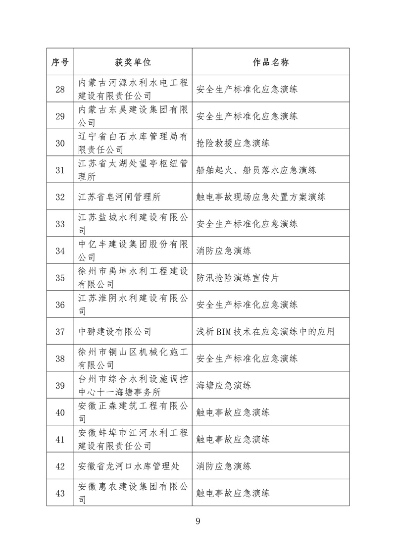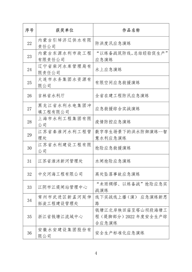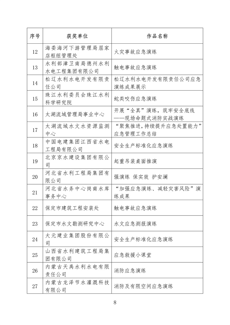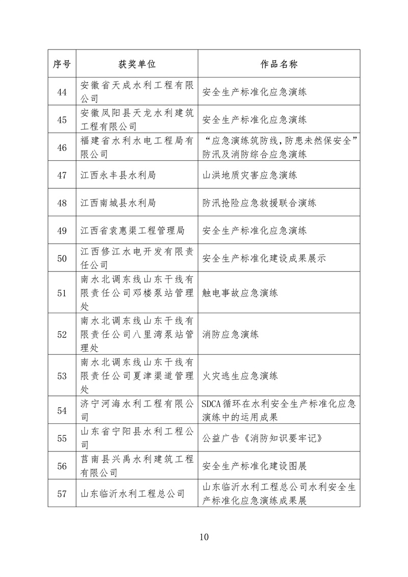 ? 根據《水利部辦公廳關于開展2022年水利“安全生產月”活動的通知》(辦監督〔2022〕159號),我部組織開展了全國水利安全生產標準化應急演練成果評選展示活動。根據競賽規則和獎勵辦法,擬對獲獎單位和成果進行公布,其中二等獎5個、三等獎68個、鼓勵獎70個、優秀組織單位獎10個,現予以公示(名單附后,一等獎空缺)。如有異議,請在公示期內以書面方式反映,并提供必要的證明材料和有效聯系方式。個人提出異議的,須在書面異議材料上簽署真實姓名,并附本人有效身份證明復印件;以單位名義提出異議的,書面異議材料須經本單位法定代表人簽字,并加蓋本單位公章。
