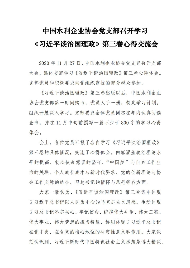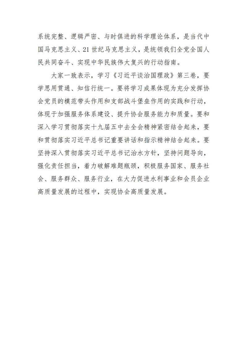 中國水利企業(yè)協(xié)會黨支部召開學習《習近平談治國理政》第三卷心得交流會